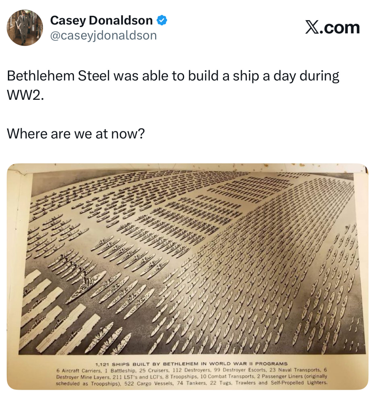 What began in Bethlehem, Pennsylvania, in 1860 producing iron rails for the Lehigh Valley Railroad grew during a period when the United States was rapidly industrializing and expanding its rail network. The company quickly moved into steel production in the late 1800s, a time marked by the rise of giants like Carnegie Steel and the emergence of the U.S. as the world’s leading steel producer. By WWII, Bethlehem Steel was a pillar of the wartime industrial mobilization, eventually building a ship per day along with tanks and artillery as part of the massive national effort that made the U.S. the most badass military force in the world.