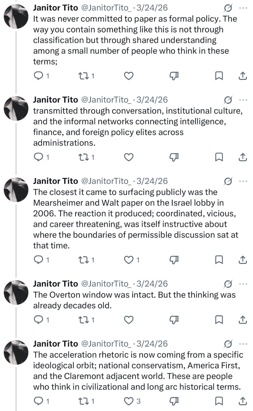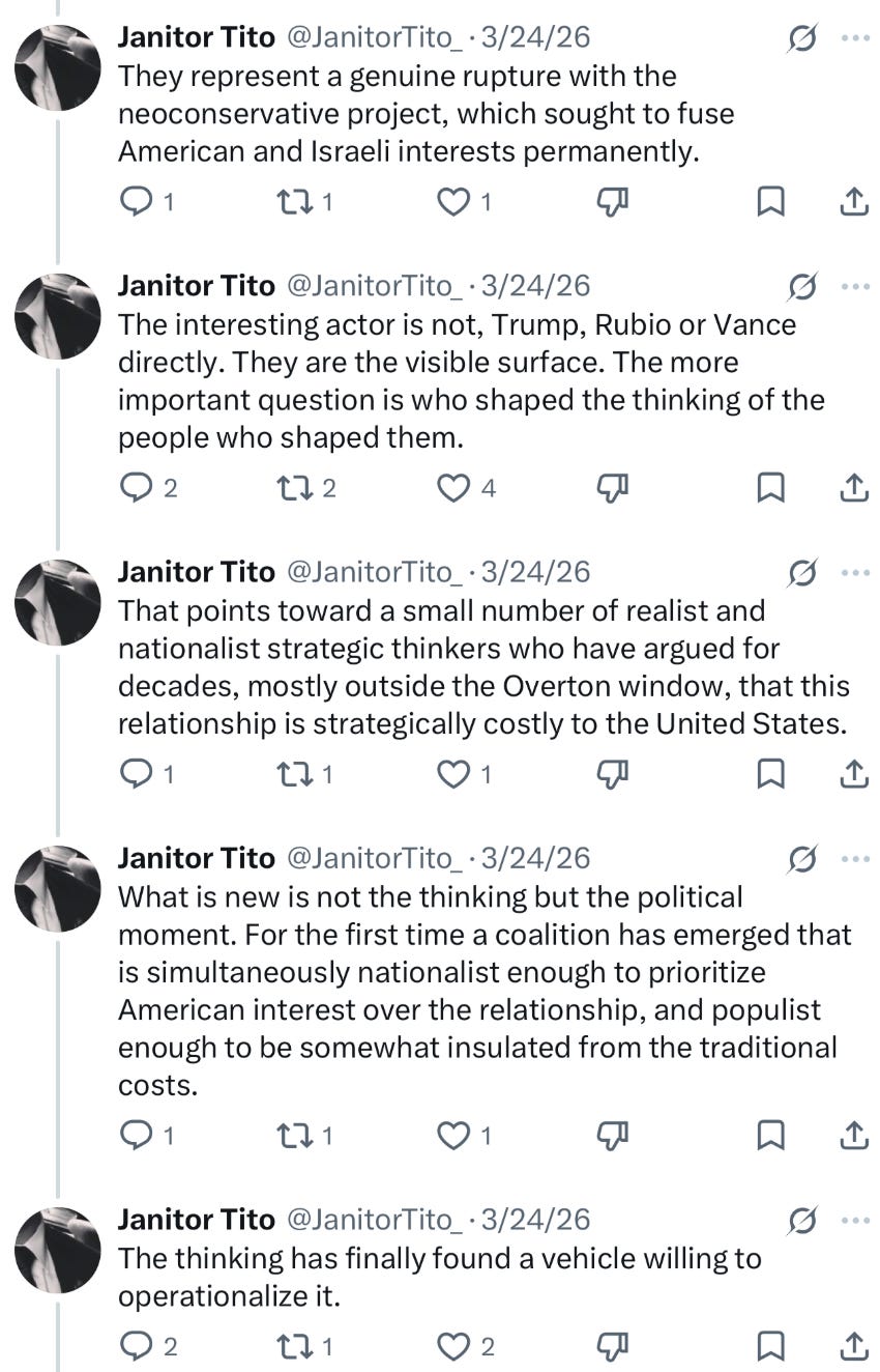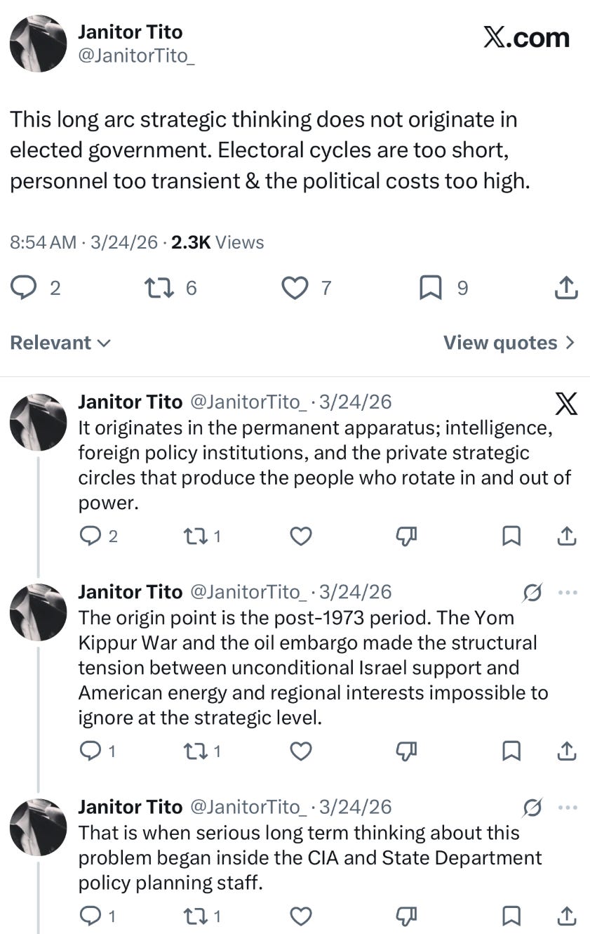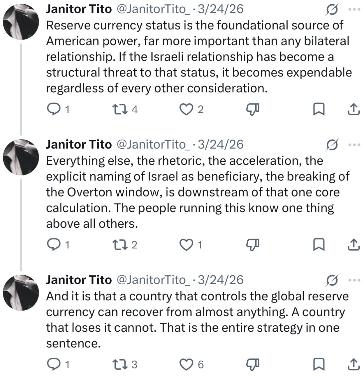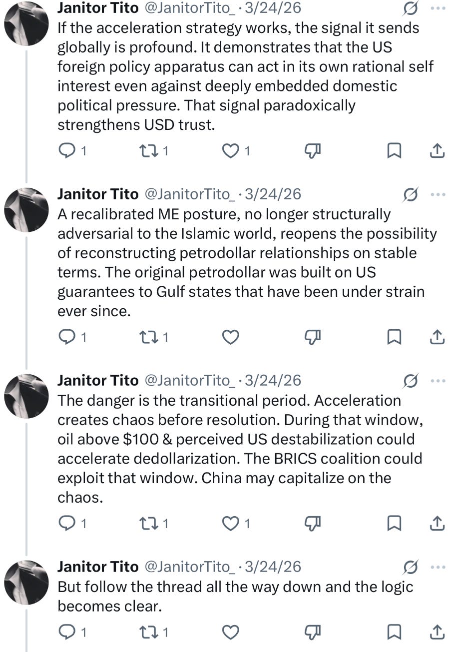 Whether you agree with Trump's policies or not, the man has had outstanding political instincts for a decade. You don't engineer the greatest political comeback in American history without them. This war has felt out of character. Luke Gromen pointed to a thread by @JanitorTito_ on X that offers the first logically coherent explanation for Trump's actions that I have seen since the bombs started falling. I am building on Gromen's framework here because it's the only alternative that makes sense.