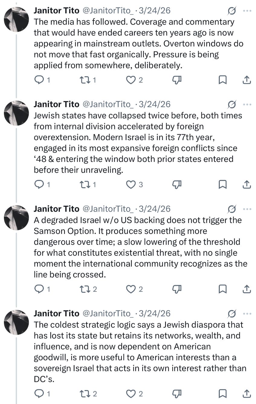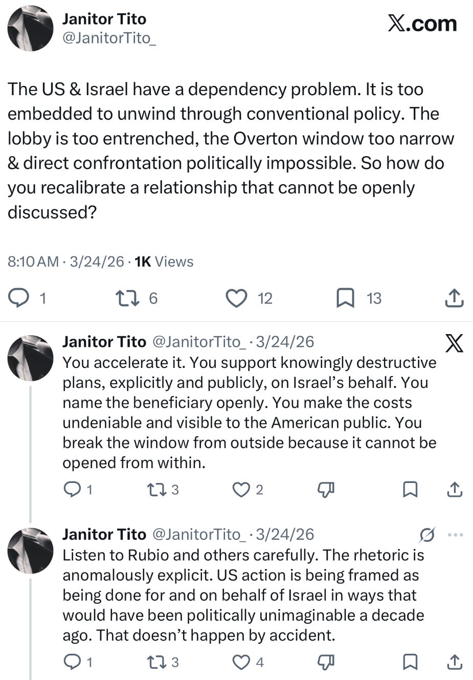 Janitor Tito’s argument begins with a structural problem. The US and Israel have a dependency that is too deeply embedded to unwind through conventional policy. The lobby is too entrenched, the Overton window too narrow, and direct confrontation politically impossible. So how do you recalibrate a relationship that cannot be openly discussed?