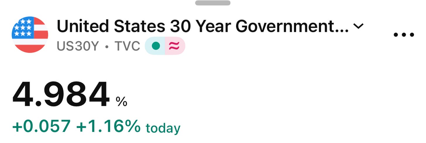 The 30-year Treasury is approaching 5%. At that level, the interest expense on America's debt becomes a fiscal death spiral. It is scientifically proven that we will go bankrupt print money if the 30-year Treasury is over 5%.