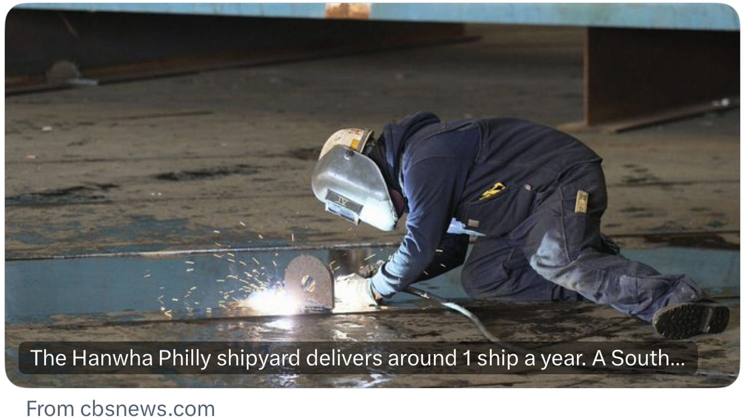 The Hanwha Philly shipyard delivers around 1 ship a year. A South Korean Hanwha shipyard delivers 1 a week. — CBS