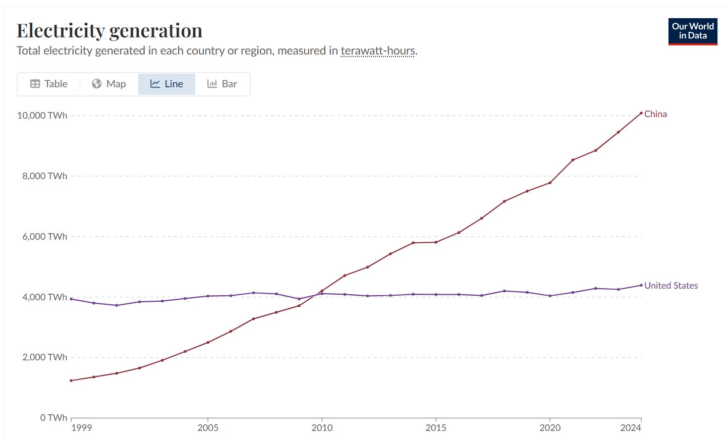 The constraining factor on building data centers is simple: you need an electrical grid capable of powering them. The US has added barely any terawatts to its grid over the last 25 years. You cannot build out AI without massive increases in energy. China has built and added an entire US grid's worth of energy capacity in the last ten years alone. So if you are Amazon, Apple, Meta, Nvidia, or Google, where are you building your data centers? New or after being hit by Iran?