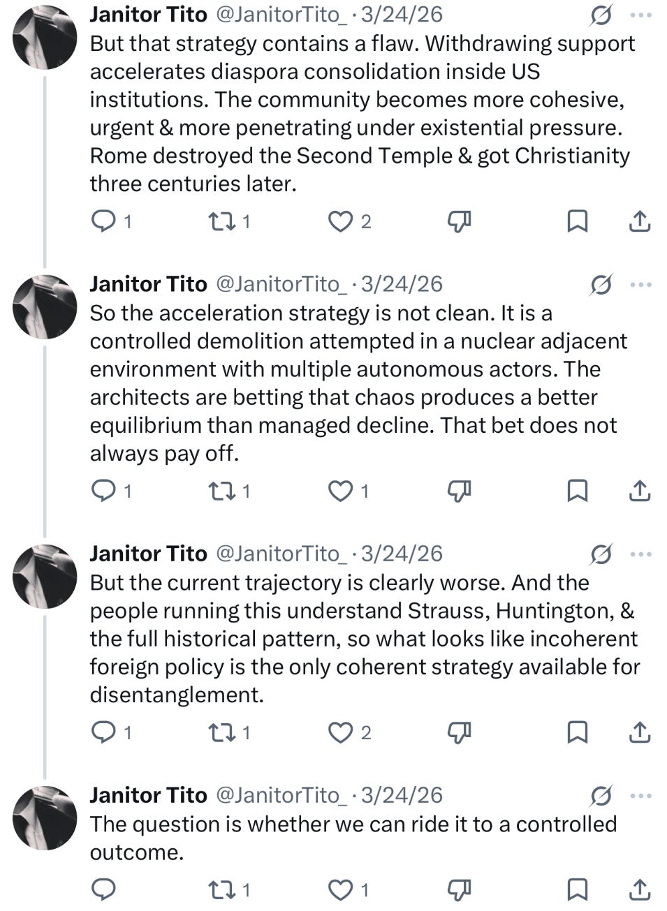 But Janitor Tito is honest about the risks. This is a controlled demolition attempted in a nuclear adjacent environment with multiple actors. The architects are betting that chaos produces a better equilibrium than managed decline. That bet does not always pay off. The danger is the transitional period — oil above $100, perceived US destabilization, and China capitalizing on the chaos to accelerate dedollarization before the strategy reaches resolution.