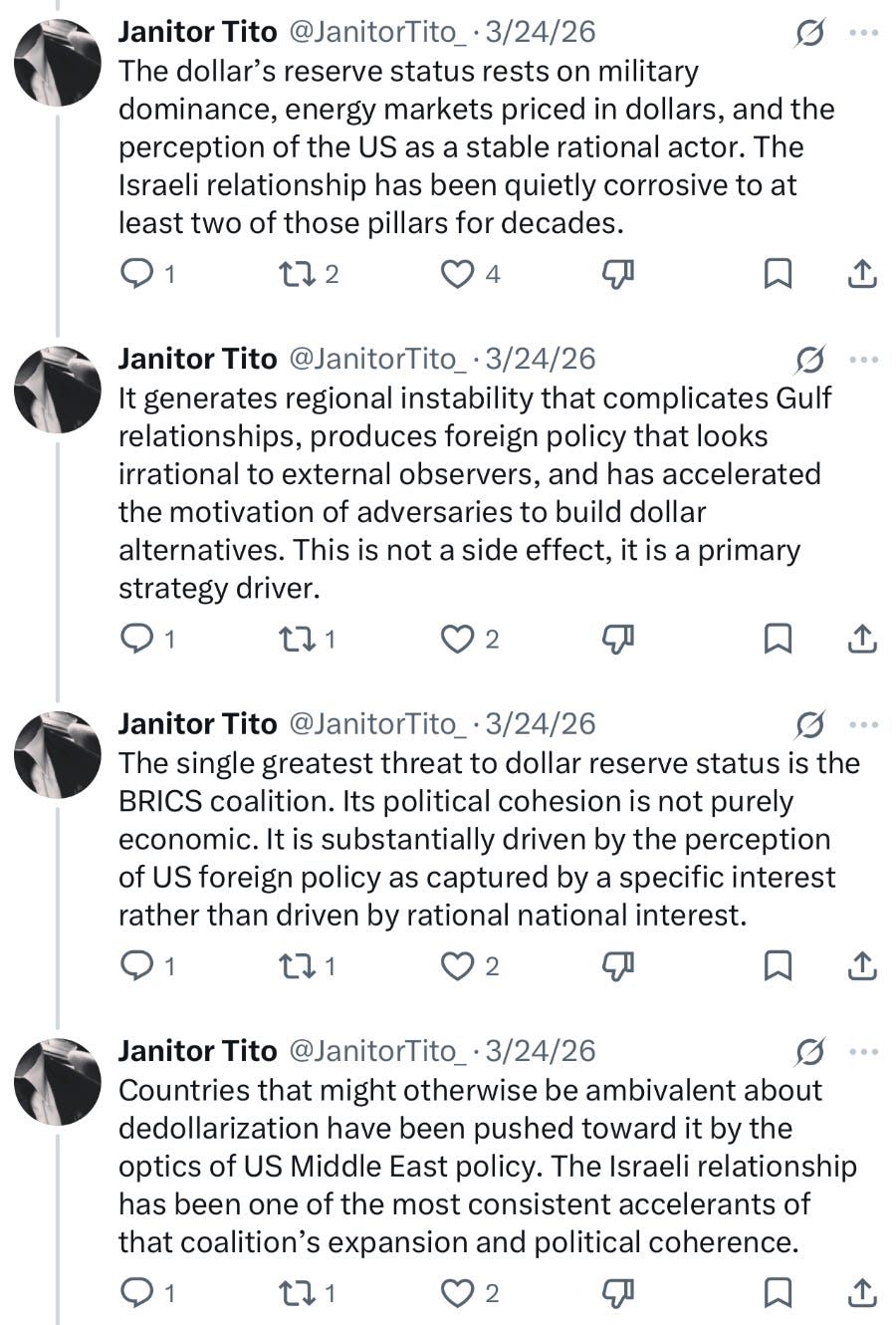 Here is the dollar connection that ties everything together, and this is where Janitor Tito’s analysis hits hardest. The dollar’s reserve status rests on three pillars: military dominance, energy markets priced in dollars, and the perception of the US as a stable, rational actor. The Israeli relationship has been quietly corrosive to at least two of those pillars for decades. It generates regional instability, complicating Gulf relationships. It produces foreign policy that looks irrational to external observers. And it has accelerated adversaries' motivation to build dollar alternatives. The single greatest threat to dollar reserve status is the BRICS coalition, and its political cohesion is substantially driven by the perception of US foreign policy as captured by a specific interest rather than driven by rational national interest of the US. Countries that might otherwise be indecisive about dedollarization have been pushed toward it by the optics of American Middle East policy.