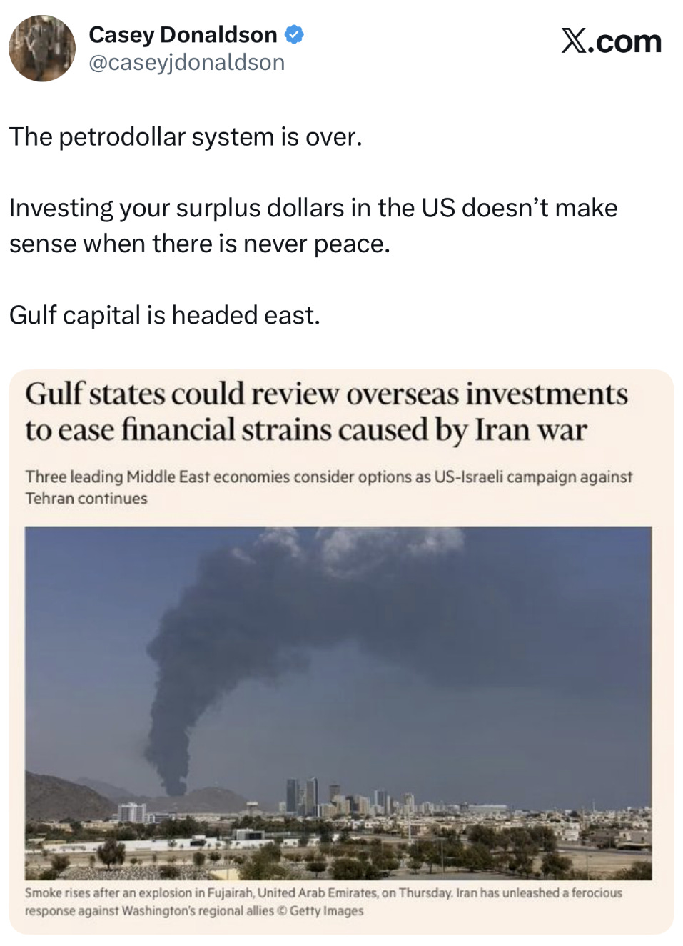 As we have seen in the Iran conflict, the security guarantees from the US are all talk. Talk is cheap when the missiles start flying…literally. From condos in Dubai to LNG plants in Qatar, if you are friends with the Americans, you are a target.